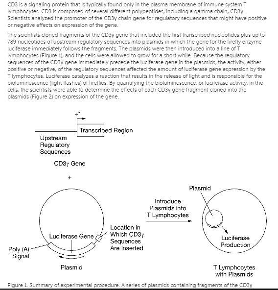 Scientists analyzed the promoter of the CD3γchain gene for regulatory sequences that might have positive or negative effects on expression of the gene. CD3 is a signaling protein that is typically found only in the plasma membrane of immune system T lymphocytes. Scientists analyzed the promoter of the CD3y chain gene for regulatory sequences that might have positive or negative effects on expression of the gene.